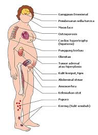 - Kulit : akne, satria keunguan, ada sedikit atau tidak ada pembentukan parut, penyembuhan luka buruk, dipunggung atas (punuk kerbau), di wajah (wajah bulan).